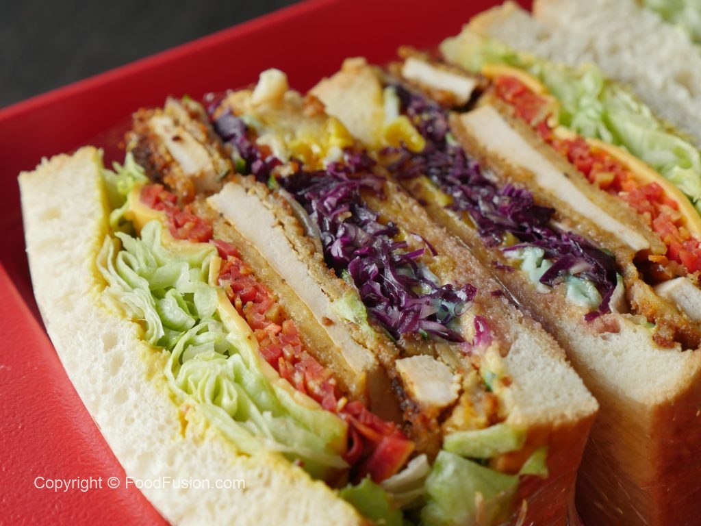 On cling film,place bread slices and apply mayo mustard spread,ice berg,cheese slice,carrots mixture, fried chicken pieces,Bbq sauce,cucumber slices,purple cabbage mixture,tomato slices,fried egg and top with another slice,wrap in cling film then cut into two pieces & serve!