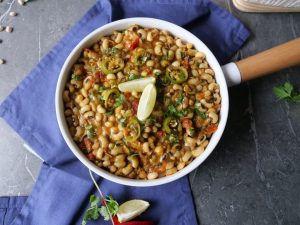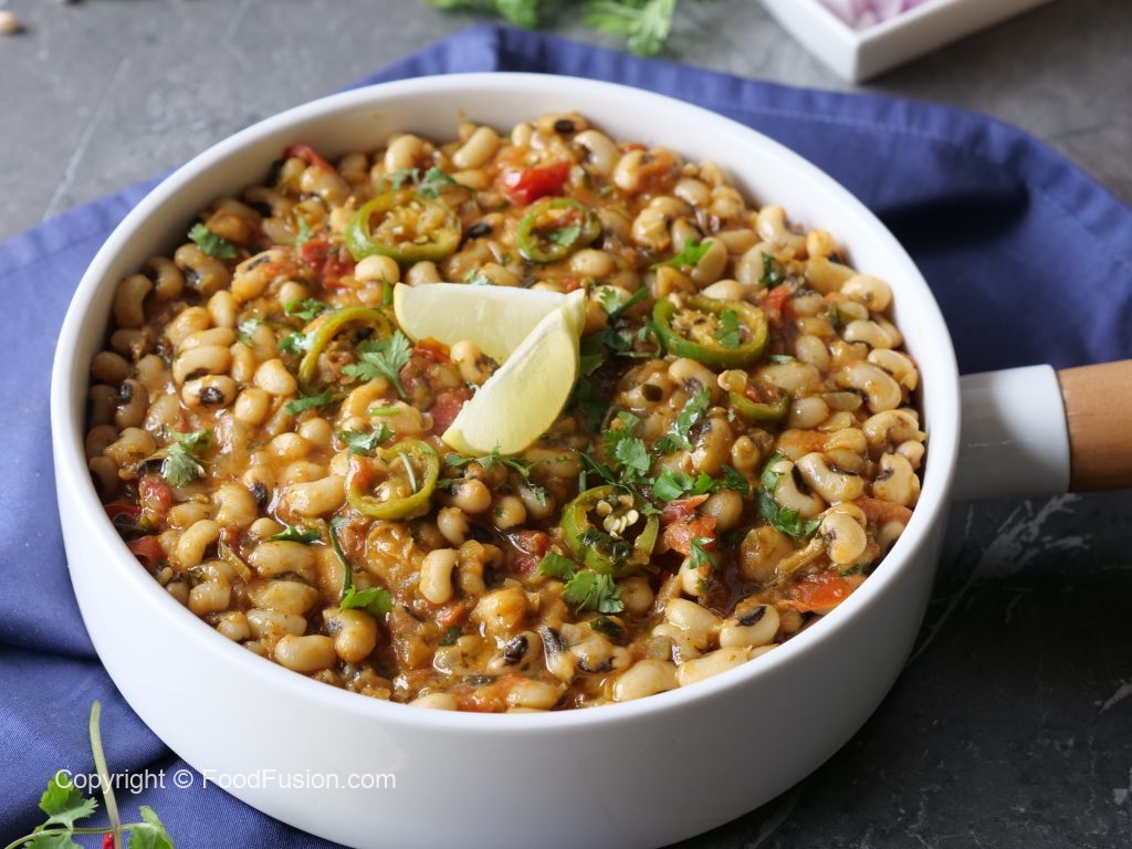 -In a pressure cooker,add black eyed beans,salt,water & mix well,cover & pressure cook for 12-15 minutes then strain & set aside.