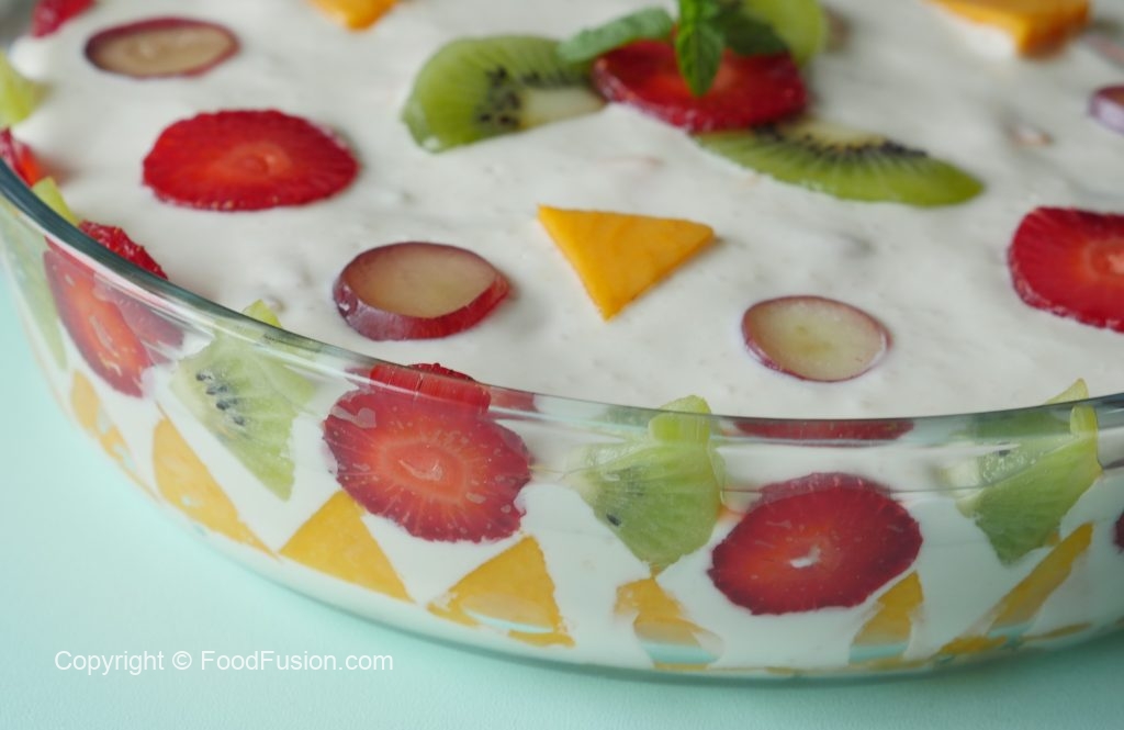 Serving dish mein banana,aam,strawberries,kiwi aur tayyar yogurt fruits dal ker serve karein.