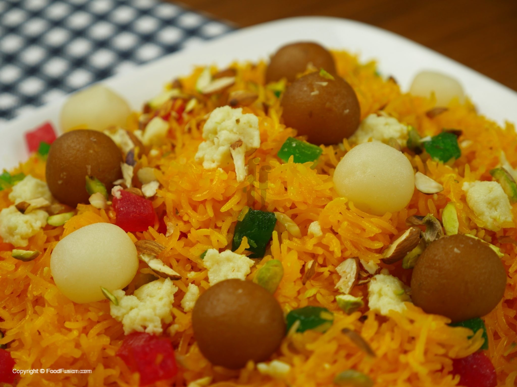 Zarda tayyar hai, gulab jamun aur cham cham sa garnish karein.